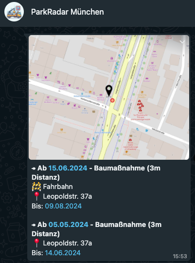 - Bei der angezeigten Dauer handelt es sich i.d.R. um den beantragten/genehmigten Zeitraum, die Baumaßnahme kann später beginnen oder länger dauern. Maßgeblich ist die konkrete Beschilderung vor Ort.